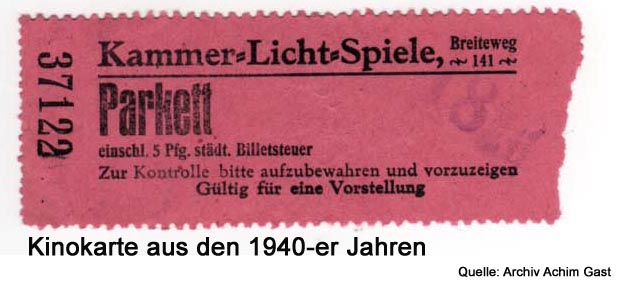 "Kammer-Lichtspiele" die sich auf dem Breiten Weg 141 vor, und nach dem II. Weltkrieg in der Richardt-Demny-Str. 19 befand. Existiert leider heute nicht mehr.