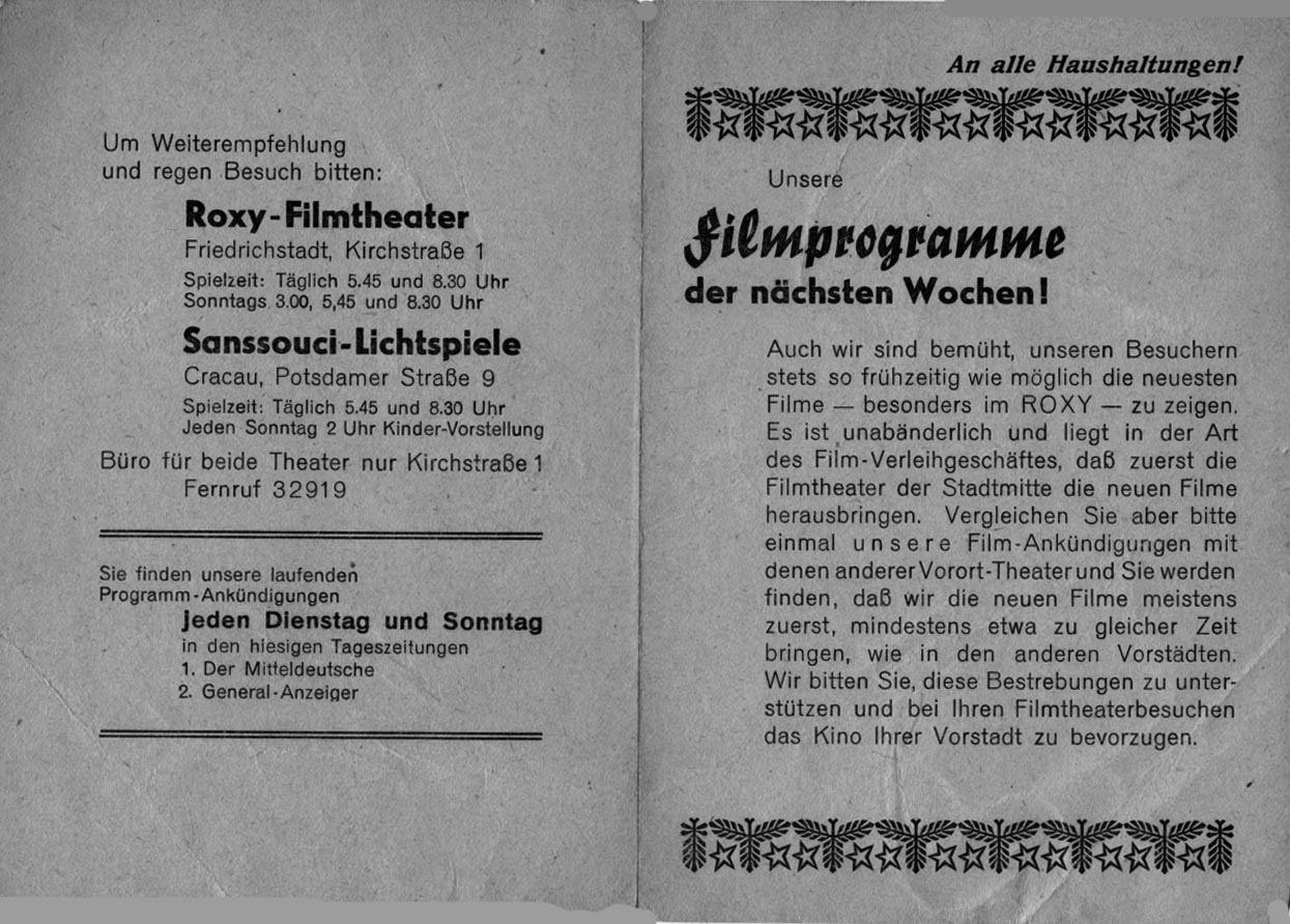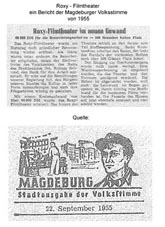 Ein Zeitungsausschnitt aus dem Jahre 1955 vom Roxy-Filmtheater-Wiederaufbau, welches später doch wieder abgerissen wurde! Einwürfe in Briefkästen